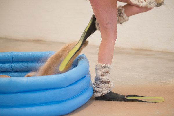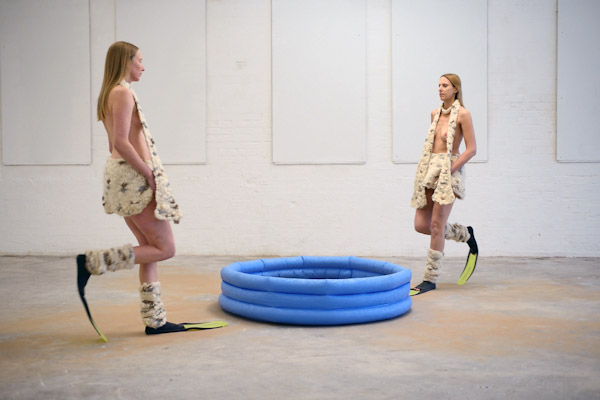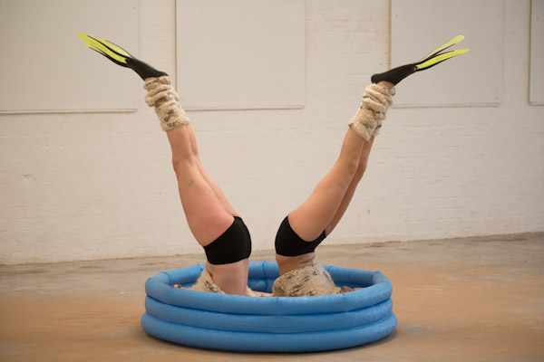 Two women, wearing wooly knitted skirts, scarves and leg-warmers as well as yellow diving fins are moving in and out of a blue inflatable pool filled with sand. Through the slapping sound of the walking, a rhythm occurs. The two women follow a complex moving pattern whereby the shape of the lemniscate (eternity symbol) is pronounced. They lay down in the pool where by their long legs are angled and stick out of the pool. The two women make a shoulder stand, then swing them self up out of the pool and continue their walk.
