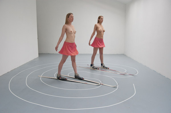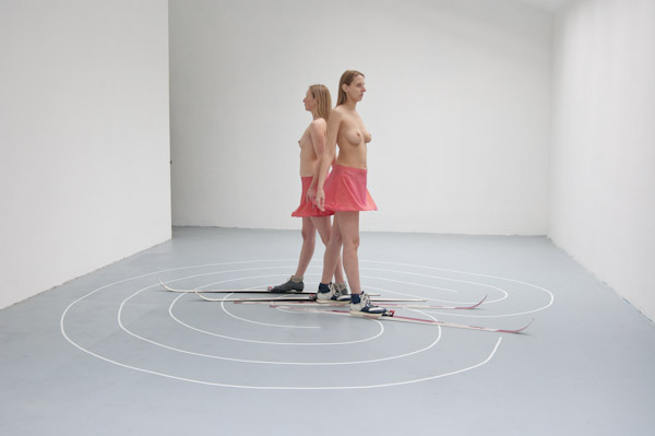 There is a large labyrinth on the floor. Wearing cross-country skis and pink miniskirts, two women are walking, bare breasted, in and out of the labyrinth. A rhythm arises as the skis are hitting the ground