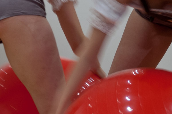 Two women, wearing short white folklore blouses and grey folklore leather shorts, are holding a red ball each in front of their chests. On their feet they are wearing white moon boots and traditional wooden snowshoes. They walk synchronised and mirrored along the shape of a Celtic Knot, moving in and out of the centre, where the balls meet and bounces off each other. You hear the rhythmical walk of the snowshoes. At one point both women sit down on the balls and starts bouncing. A clapping game starts. Suddenly both women stand up, grabbing the others ball, lift them up and continue there walk.