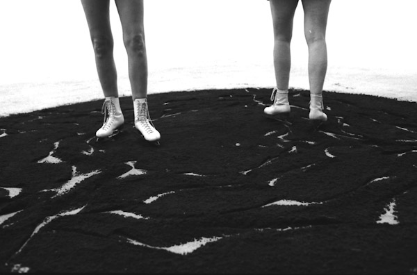 There is a circle of used coffee grounds on the concrete floor. Two women enter and stand, facing each other, on opposite sides. The bare breasted women are wearing white ice skates and white fur jackets. They are each holding a sack of coffee beans, from where rhythmical music is heard. The two women cut into the coffee grounds with there skates. They slide synchronised in a circular movement towards the centre, ending back to back, as they meet in the middle. Left behind in the coffee grounds are the tracks of a compass rose.
